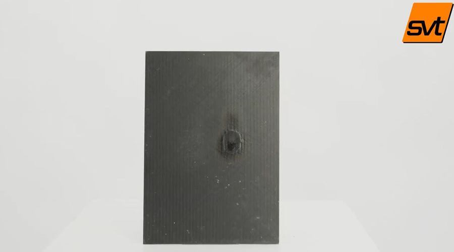 我們對已成型的防火織物復合材料板進行了高溫粒子轟擊測試,測試溫度達到了1400度。我們采用環氧樹脂體系制作了電池包外殼,這種材料比傳統的鋁基材料輕了40%,但其堅韌程度最高可提升5倍。此外,該材料具有出色的防火性能,并且能夠耐受高溫火焰沖擊,測試中接近1400℃的高溫火焰沖擊下,23秒內沒有發生任何變形或穿燒現象。相比之下,鋁材質在相同的溫度和距離下只需要6秒即被燒穿。